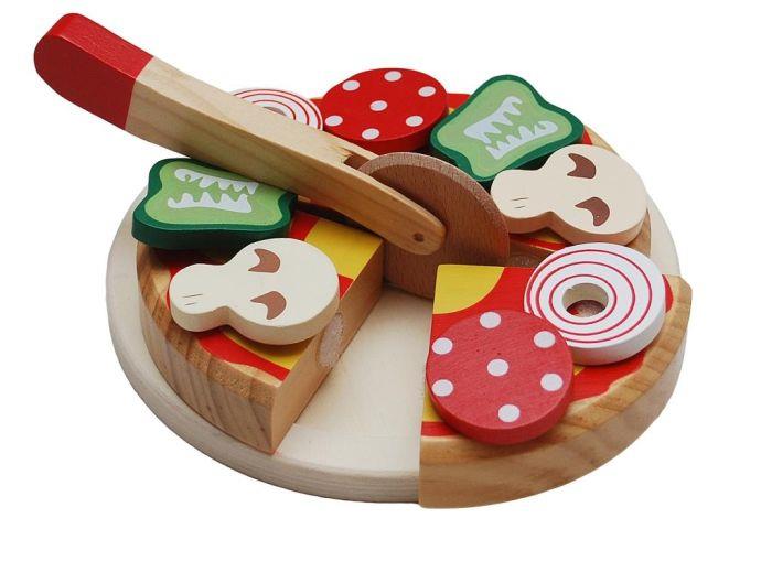Pizza zum Schneiden Ist die perfekte Ergänzung für jede Kinderspielküche. Das Set besteht aus 1 Pizzateller, 1 Pizza mit 6 Teilen und 1 Pizzamesser. Aus hochwertigem Holz. Ab 3 Jahren.